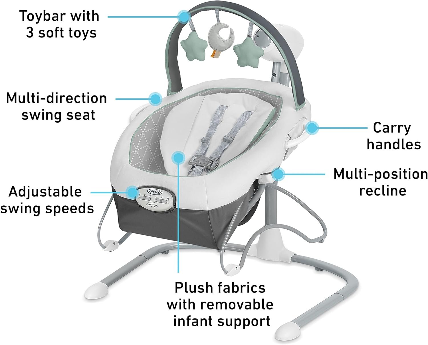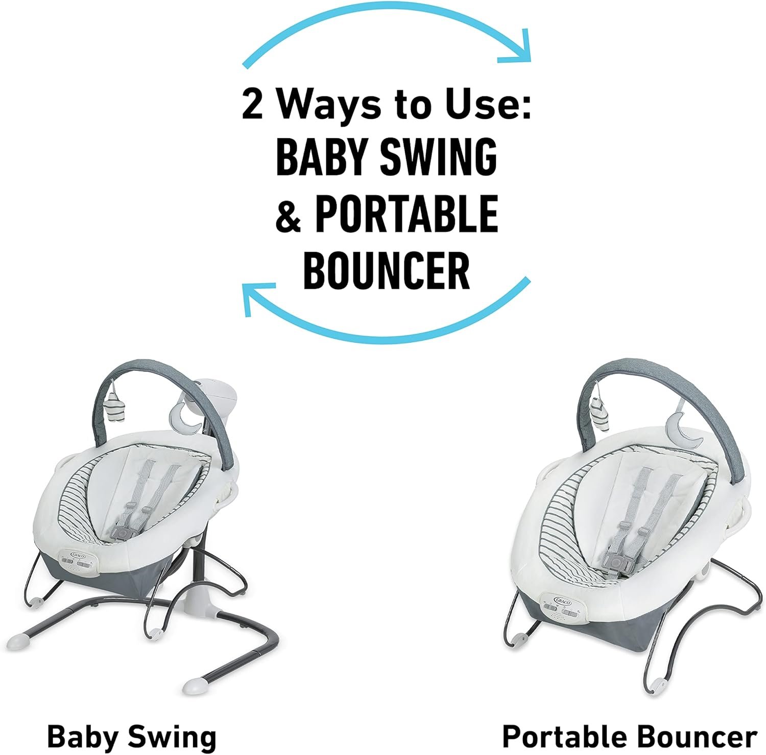 The Graco Soothe ’n Sway LX is a versatile 2-in-1 system that converts seamlessly from a full-featured baby swing to a portable bouncer with carry handles. Designed for customizable comfort, it boasts a multi-direction seat for side-to-side or front-to-back swinging, adjustable speeds, 3-position recline, and 2-speed vibration. The convenience of an included AC adapter eliminates constant battery replacements, and the plush, removable infant insert ensures a cozy fit from day one. Perfect for keeping baby soothed and secure in any room of the house.